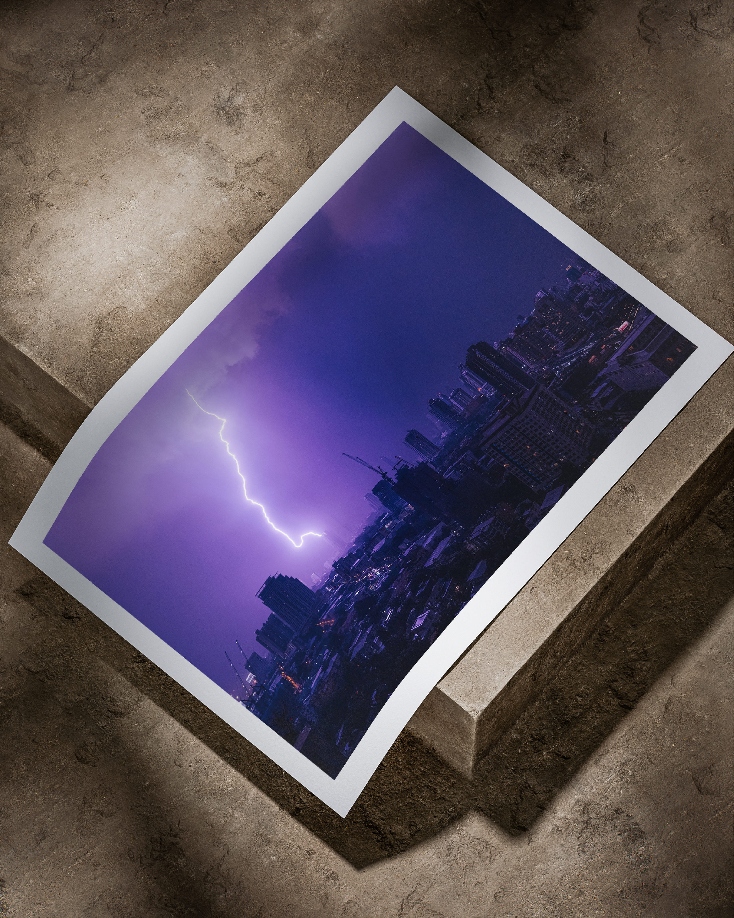 A heartbeat caught in a split second—this electrifying cityscape is lit by a stunning purple lightning strike cutting through the sky.